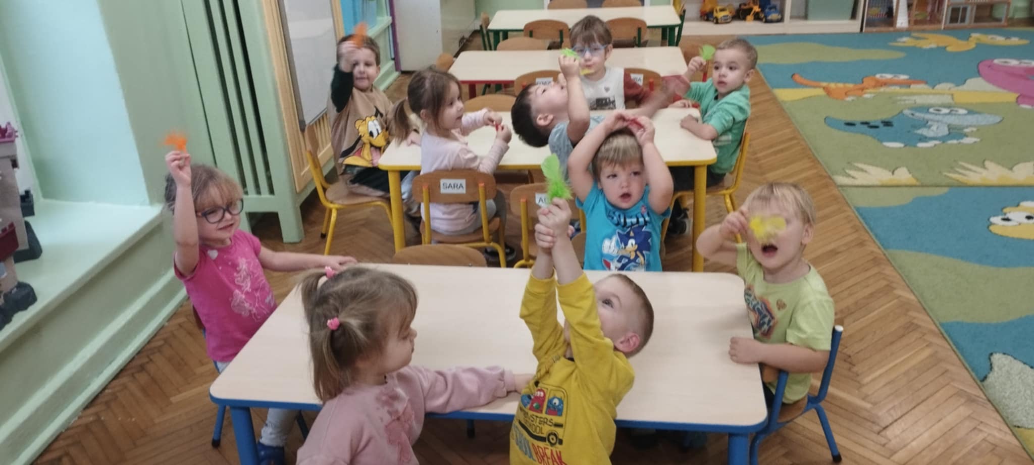 Grupa Słoneczka wzięła udział w zajęciach oddechowych, podczas których dzieci uczyły się prawidłowego oddychania poprzez zabawę. Przedszkolaki z radością dmuchały w kolorowe piórka, obserwując, jak unoszą się w powietrzu. Ćwiczenia te nie tylko sprawiły im wiele frajdy, ale również pomogły w rozwijaniu koncentracji, uspokojeniu oddechu i wzmacnianiu mięśni oddechowych.